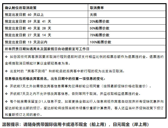 2)我社保留根據(jù)具體情況更改行程的權(quán)利,以上行程僅供參考,請(qǐng)以出發(fā)登船通知行程為準(zhǔn)。離港時(shí)間僅供參考。